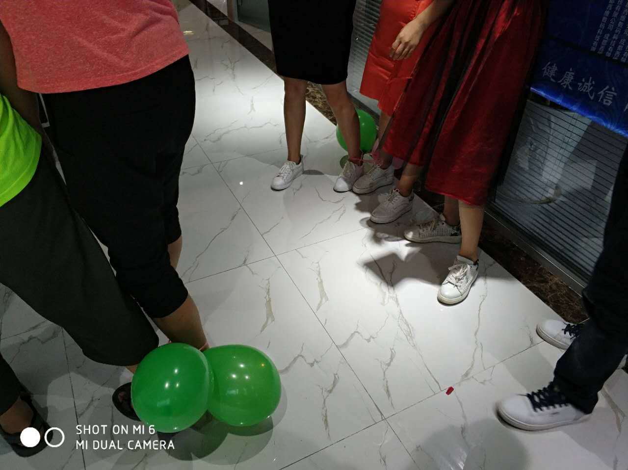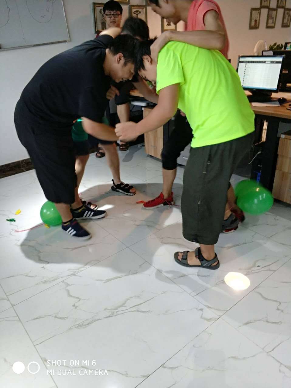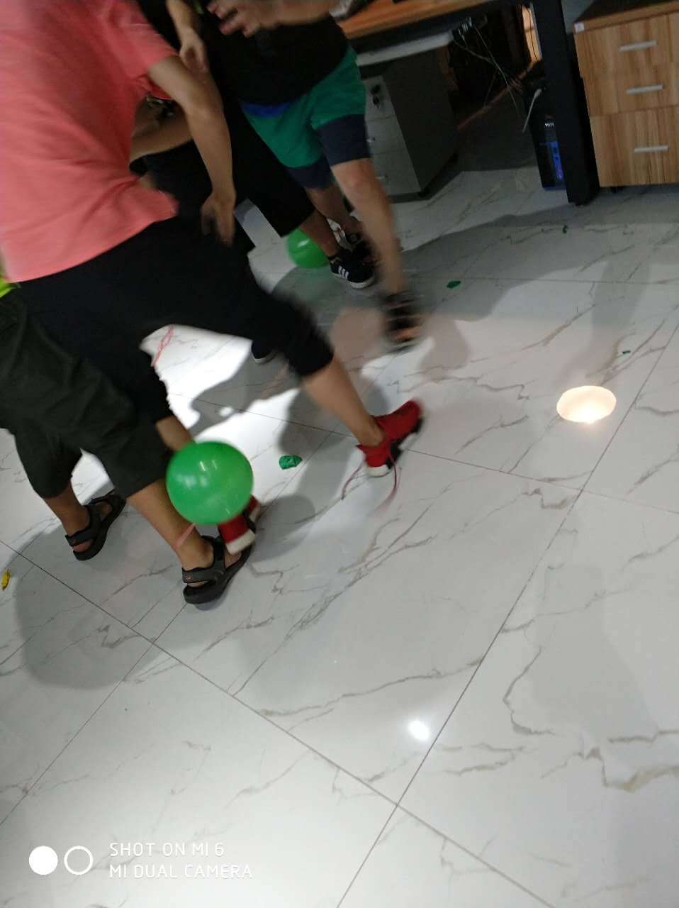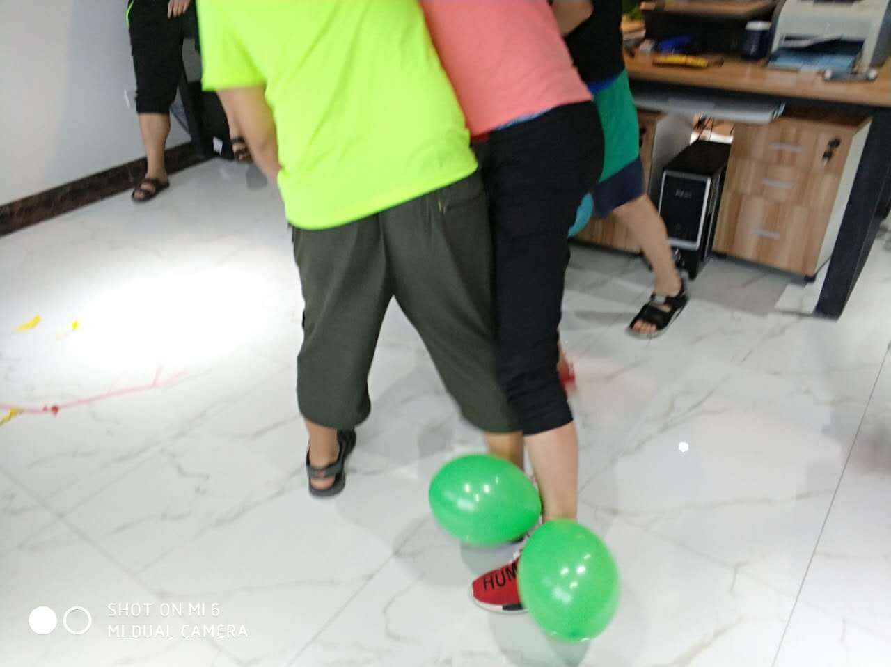 時間過得相當的快,不經意就來到了最后一個環節,踩氣球。兩隊每兩個成員綁上氣球,相互對抗,踩爆他的球~~~噢?。。⌒【幩坪蹩吹搅艘粓鲅晷蕊L。